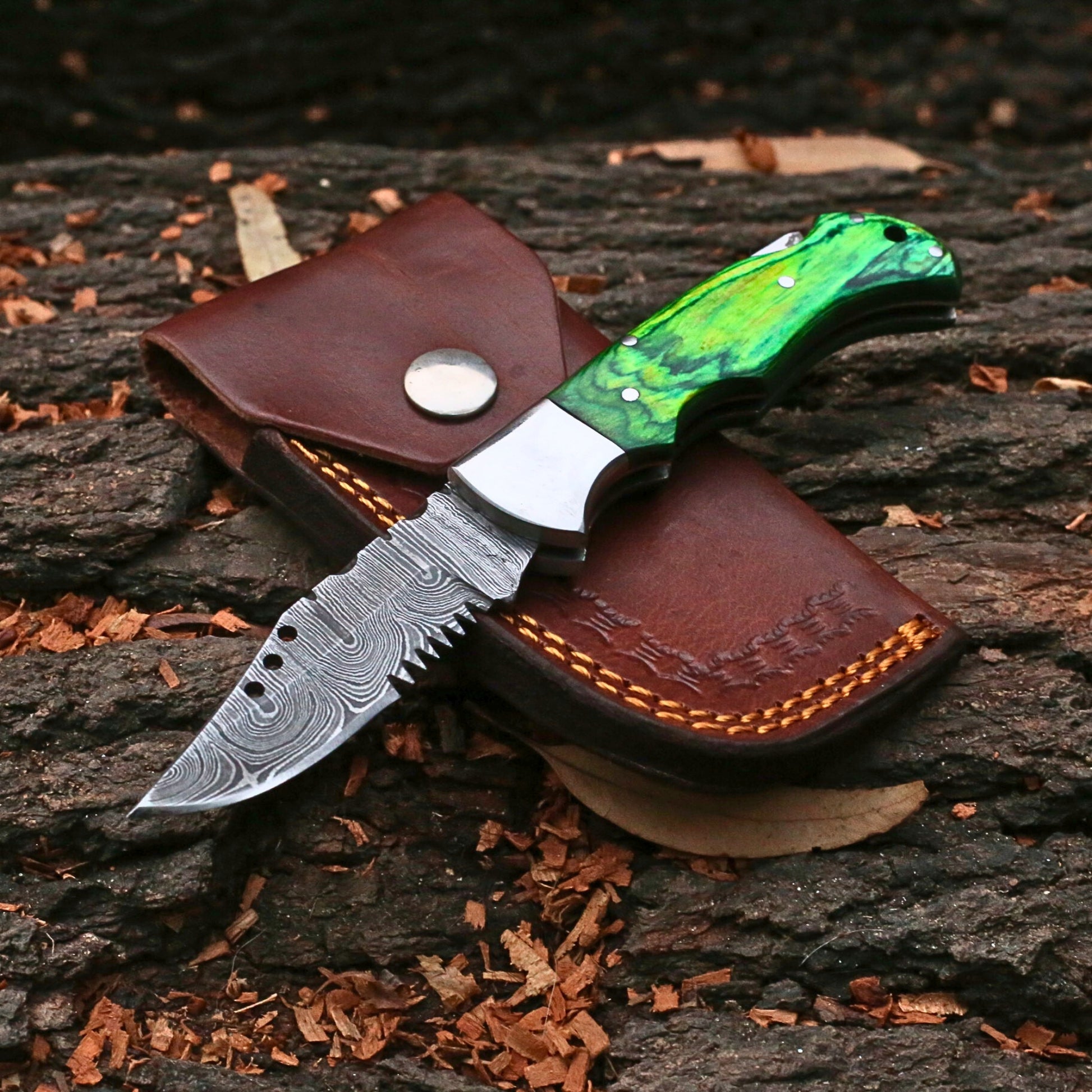 Handmade Damascus Steel Folding Pocket Knife | Custom EDC Knife with Leather Sheath-FK506