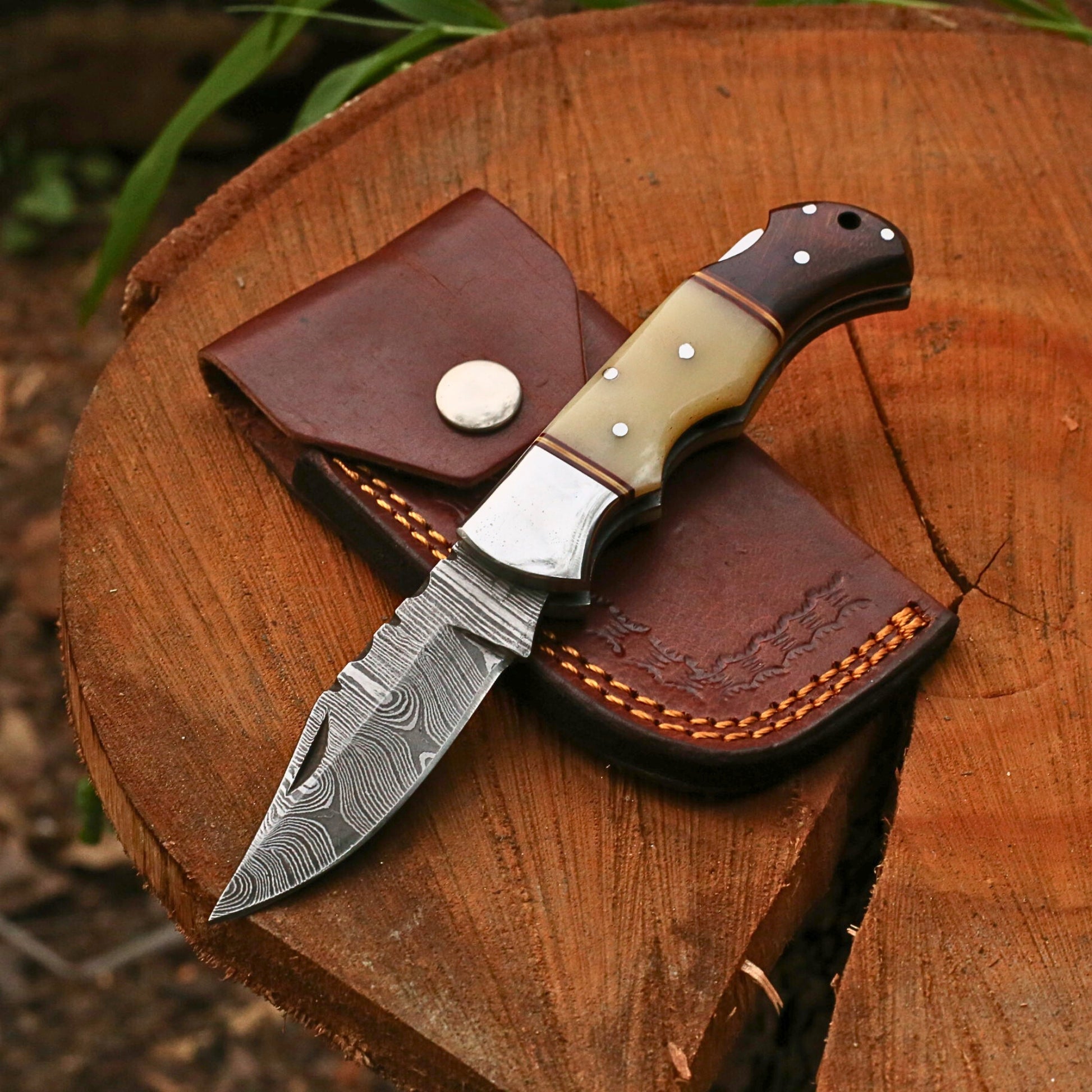 Handmade Damascus Steel Folding Pocket Knife | Custom EDC Knife with Leather Sheath-FK508