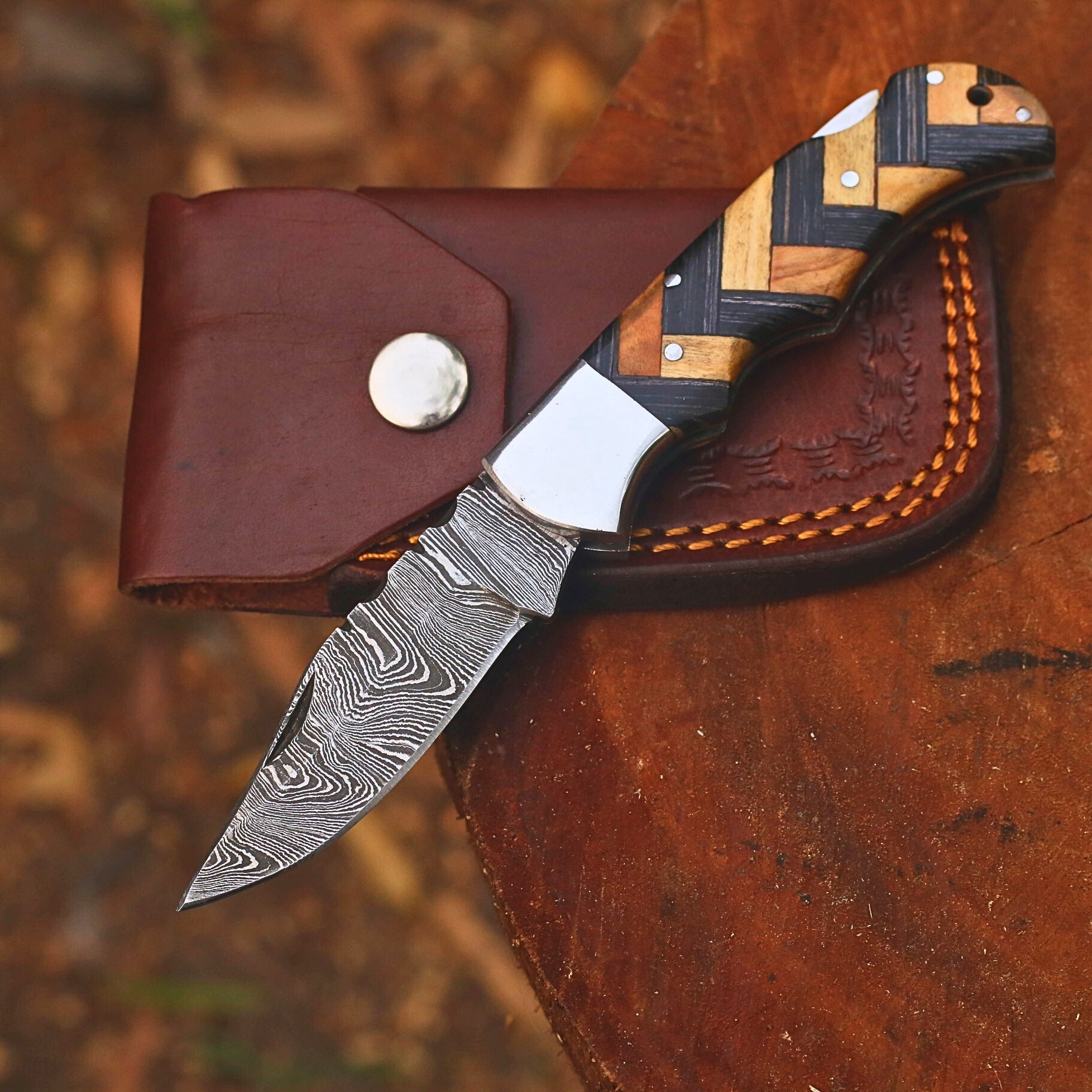 Handmade Damascus Steel Folding Pocket Knife | Custom EDC Knife with Leather Sheath-FK524