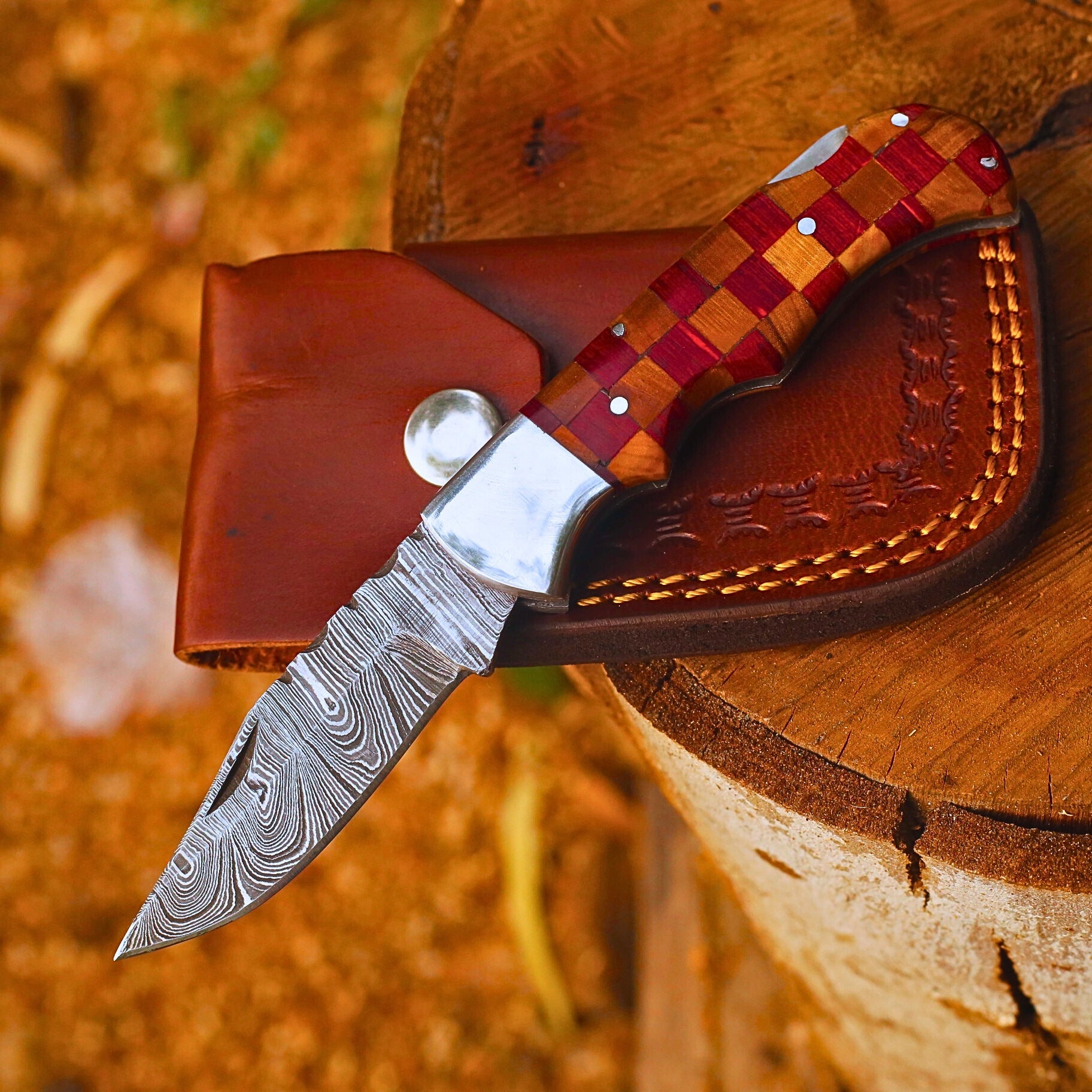 Handmade Damascus Steel Folding Pocket Knife | Custom EDC Knife with Leather Sheath-FK529